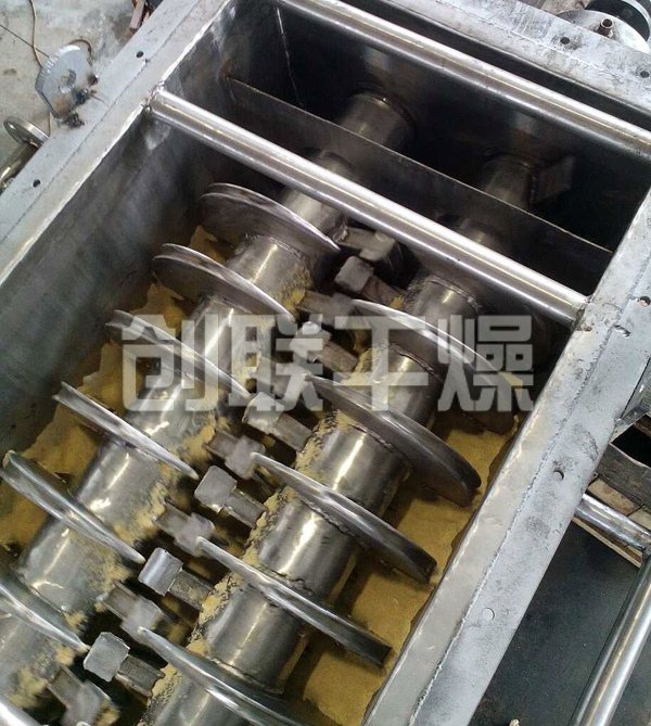 空心軸上密集排列著(zhù)楔型中空漿葉,熱介質(zhì)經(jīng)空心軸流經(jīng)漿葉。單位有效容積內傳熱面積很大,熱介質(zhì)溫度從-40℃到320℃,可以是水蒸汽,也可以是液體型:如熱水、導熱油等。間接傳導加熱,沒(méi)有攜帶空氣帶走熱量,熱量均用來(lái)加熱物料。熱量損失僅為通過(guò)器體保溫層向環(huán)境的散熱。楔型漿葉傳熱面具有自清潔功能。物料顆粒與楔型面的相對運動(dòng)產(chǎn)生洗刷作用,能夠洗刷掉楔型面上附著(zhù)物料,使運轉中一直保持著(zhù)清潔的傳熱面。漿葉干燥機的殼體為Ω型,殼體內一般安排二到四根空心攪拌軸。殼體有密封端蓋與上蓋,防止物料粉塵外泄而充分發(fā)揮作用。