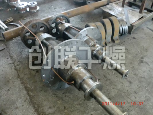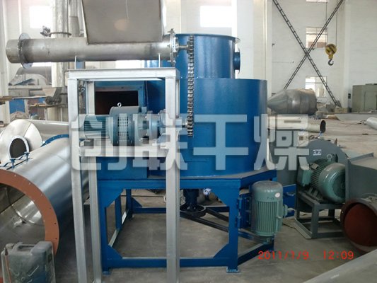 熱空氣切線(xiàn)進(jìn)入干燥器底部,在攪拌器帶動(dòng)下形成強有力的旋轉風(fēng)場(chǎng)。膏狀物料由螺旋加料器進(jìn)入干燥器內,在高速旋轉攪拌槳的強烈作用下,物料受撞擊、磨擦及剪切力的作用下得到分散,塊狀物料迅速粉碎,與熱空氣充分接觸、受熱、干燥。脫水后的干物料隨熱氣流上升,分級環(huán)將大顆粒截留,小顆粒從環(huán)中心排出干燥器外,由旋風(fēng)分離器和除塵器回收,未干透或大塊物料受離心力作用甩向器壁,重新落到底部被粉碎干燥。