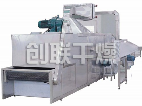 物料由加料器均勻地鋪在網(wǎng)帶上,網(wǎng)帶一般采用12-60目不銹鋼絲網(wǎng),由傳動(dòng)裝置拖動(dòng)在干燥機內移動(dòng)。干燥機由若干單元組成,每一單元熱風(fēng)獨立循環(huán),部分尾氣由專(zhuān)門(mén)排濕風(fēng)機排出,廢氣由調節閥控制,熱氣由下往上或由上往下穿過(guò)鋪滿(mǎn)物料的網(wǎng)帶完成熱量與質(zhì)量傳遞的進(jìn)程,帶走物料水份。網(wǎng)帶緩慢移動(dòng),運行速度可根據物料溫度自由調節,干燥后的成品連續落入收料器中。上下循環(huán)單元根據用戶(hù)需要可靈活配備,單元數量亦可根據需要選取。