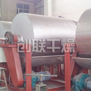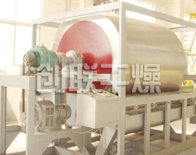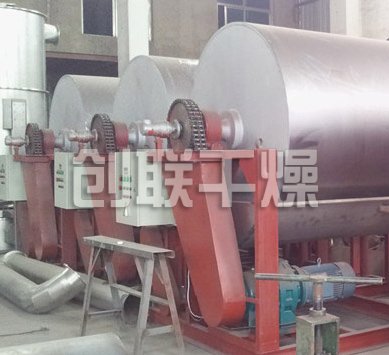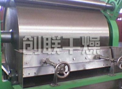 滾筒干燥機是一種內加熱傳導型轉動(dòng)連續干燥設備。旋轉的滾筒通過(guò)其下部料槽,粘附著(zhù)一厚度的料膜,熱量通過(guò)管道輸送至滾筒內壁,傳導到滾筒外壁,再傳導給料膜,使料膜中的濕得到蒸發(fā)、脫濕、使含濕分的物料得到干燥。干燥好的物料被裝置在滾筒表面的刮刀鏟離滾筒,到置于刮刀下方的螺旋輸送器,通過(guò)螺旋輸送器將干物料集中、包裝。