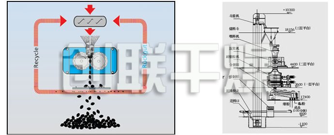 對輥式擠壓造粒的工藝原理是:干物料在壓力作用下團聚成致密堅硬的大塊(餅料),稱(chēng)為擠壓過(guò)程;餅料再被破碎篩分后成為顆粒料稱(chēng)為造粒過(guò)程。擠壓的作用一是將顆粒間的空氣擠掉,另外是使顆粒間距達到足夠近,以產(chǎn)生如范德華力、吸附力、晶橋及內嵌連接等吸引力。擠壓造粒的顆粒主要是靠分子之間的作用力形成的顆粒強度。