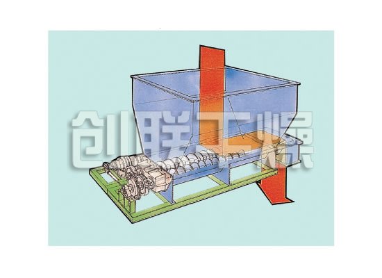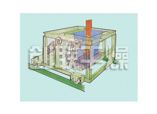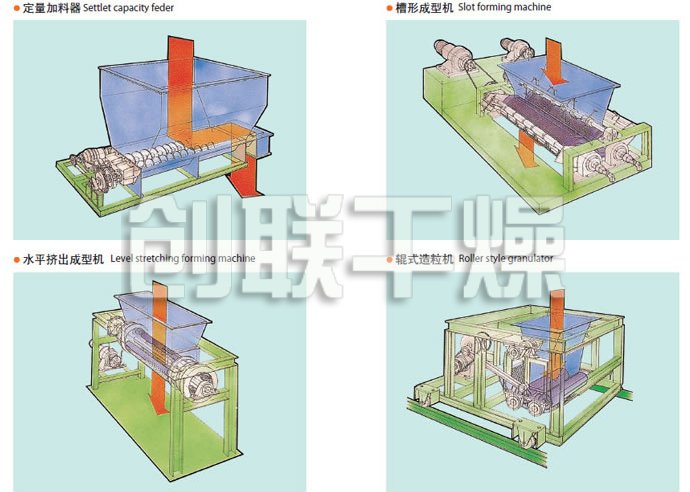 ◎水平擠出成型機: 由加料斗、二根輥子和U形振動(dòng)網(wǎng)構成。以增大物料的表面積為目的,造粒物料與振動(dòng)網(wǎng)接觸,由旋轉輥子的強制壓力擠出網(wǎng)外,形成圓柱形的顆粒。